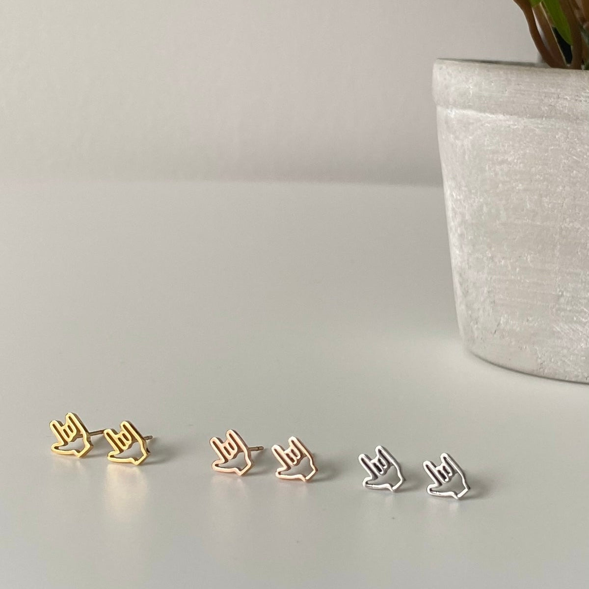 These outline ILY (I Love You) stud earrings feature a clean, minimal design that’s both lightweight and versatile. Each earring measures 8 mm × 6.6 mm and 1.5 mm thick, making them ideal for everyday wear.