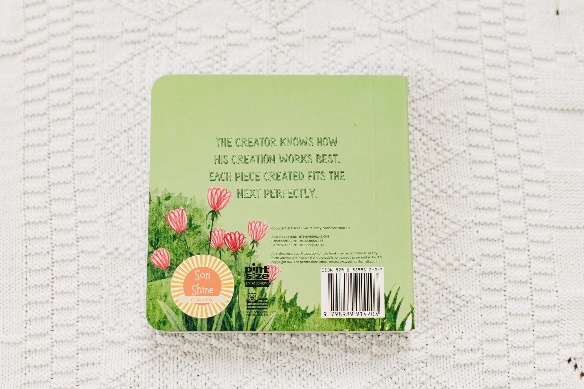 The Creator knows how His creation works best. Each piece created fits the next perfectly. Enjoy this read with your child as you speak to them about God’s truths. This board book is for Christian parents wanting to help their child gain a Christian worldview. It says to our child all of our greatest hopes for them—for them to know God, serve Him and be in Heaven together one day.